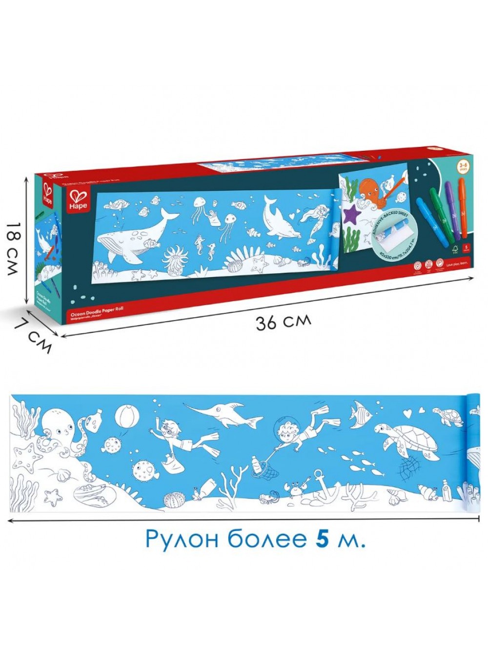 Комплектация: рулон бумаги длиной свыше 5 метров (бумага удобно отрывается каждые 40 см) и 4 цветных восковых карандаша.