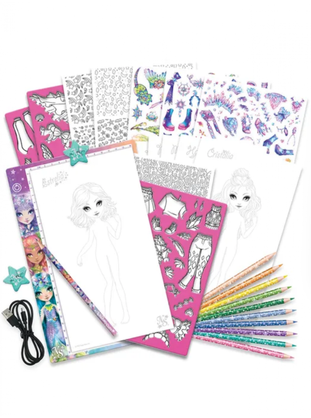 Комплектация: ультратонкий световой планшет, USB-кабель, 10 цветных карандашей, простой карандаш, 30-страничный блокнот для рисования, 6 образцов страниц с выкройками, 3 листа с трафаретами, 3 листа с наклейками, 2 зажима для бумаги, инструкция
