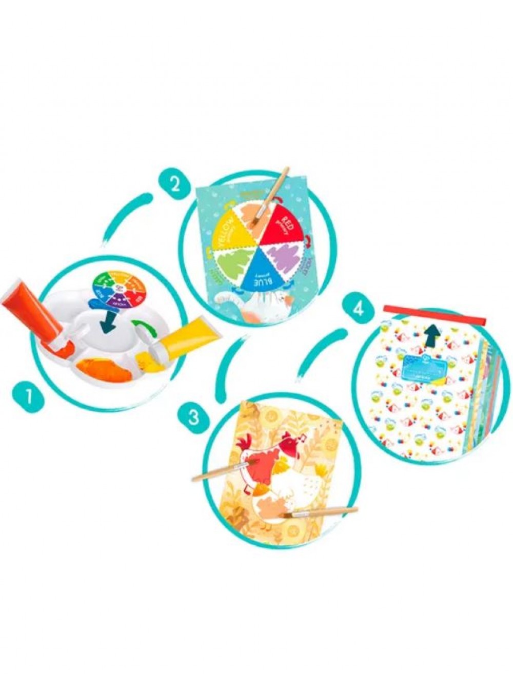 • Включает три тюбика с краской по 60 мл, одну палитру, один цветовой круг, три кисти, один альбом для занятий формата A3 и один зажим для переплета.