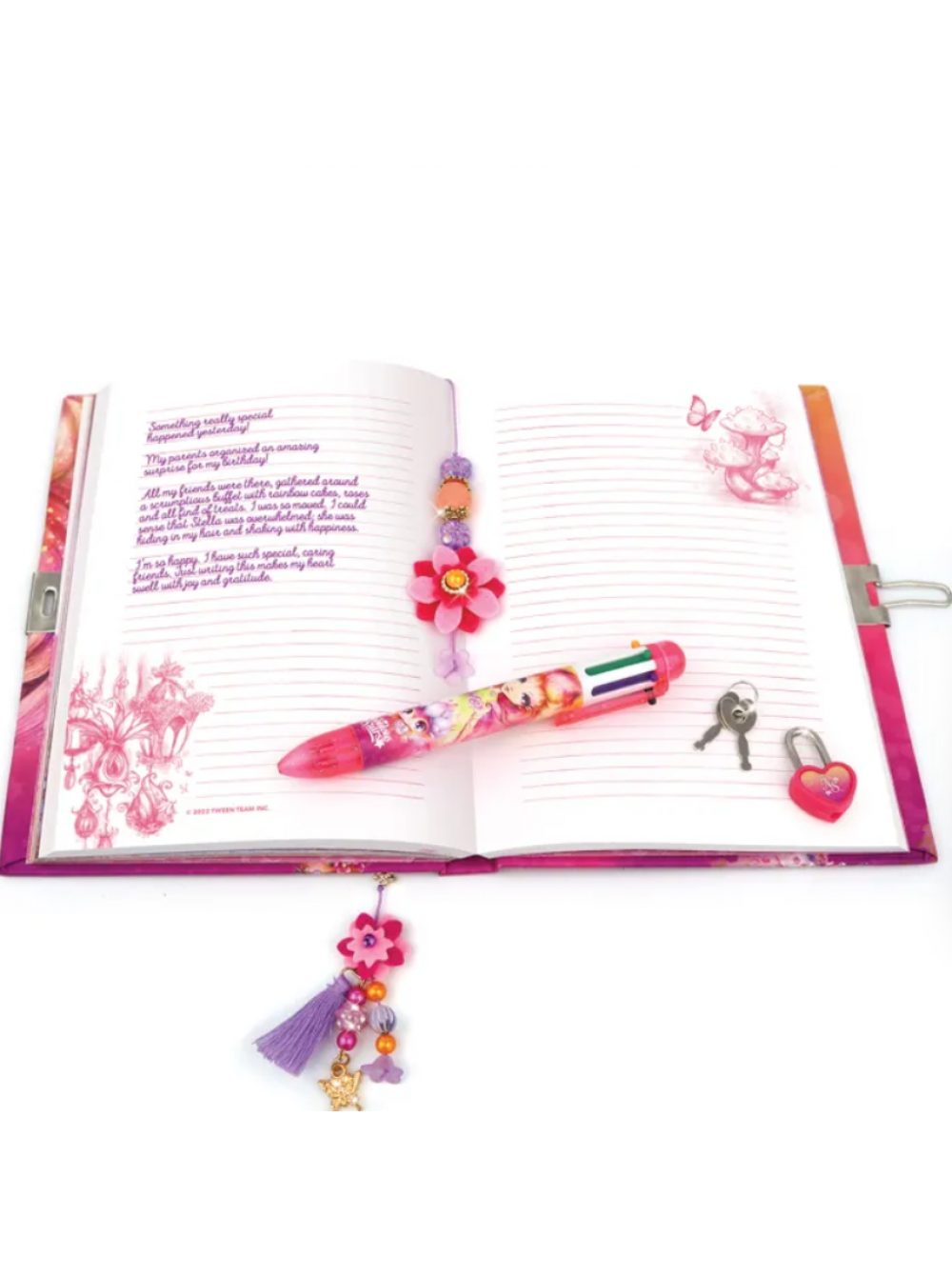 Комплектация: ручка с 6 стержнями разных цветов, бусины, подвески, войлочные цветы, шнур. Содержание страниц дневника: полная история звёздочки Petulia, 44 страницы с интересными заданиями и играми, наклейки, 150 разлинованных страниц.