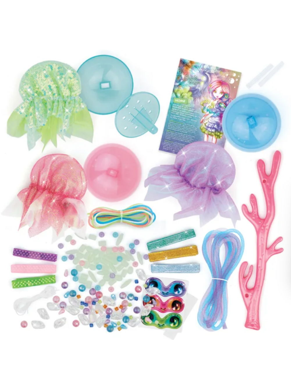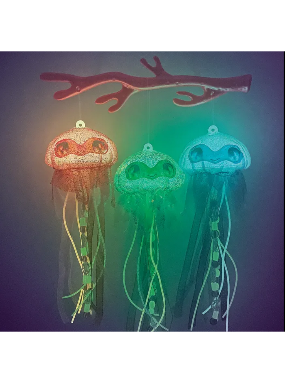 Набор для творчества "Сверкающие медузы" по созданию оригинального подвесного украшения, светящегося в темноте. Изготовление декоративных медуз с помощью заготовок из набора (купола, бусин, ленты, тканевых чехлов) и размещение их на вешалке в виде кораллов.