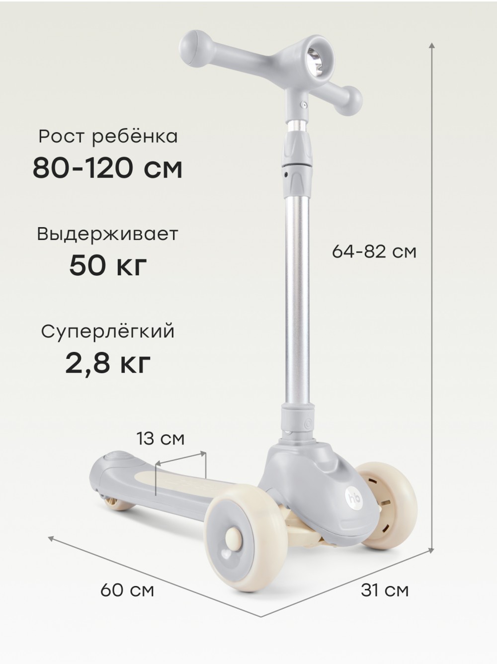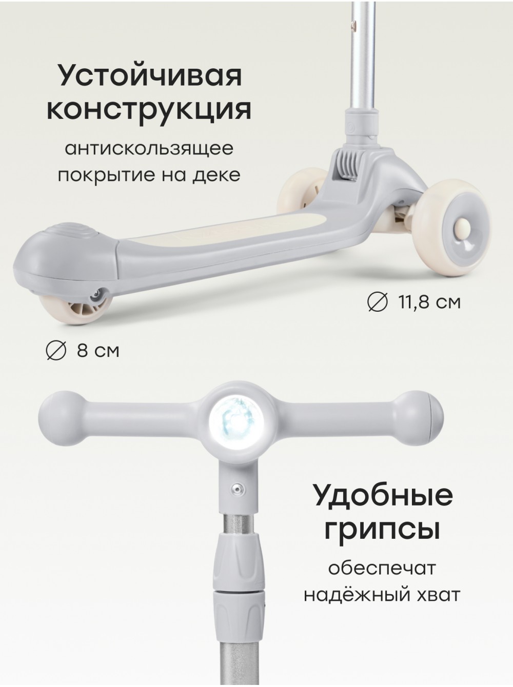 Лёгкий и маневренный трёхколесный самокат подойдет для первого знакомства со спортом. Прослужит несколько лет благодаря регулируемой высоте руля. Управление интуитивно понятно: для поворота достаточно наклонить руль в нужную сторону. Колеса и платформа имеют подсветку, которые сопровождаются весёлой музыкой. Платформа с антискользящим покрытием выдерживает вес до 50 кг. Ручки выполнены из приятного на ощупь материала. Стильный самокат – воплощение мечты ребёнка об идеальном первом транспорте.