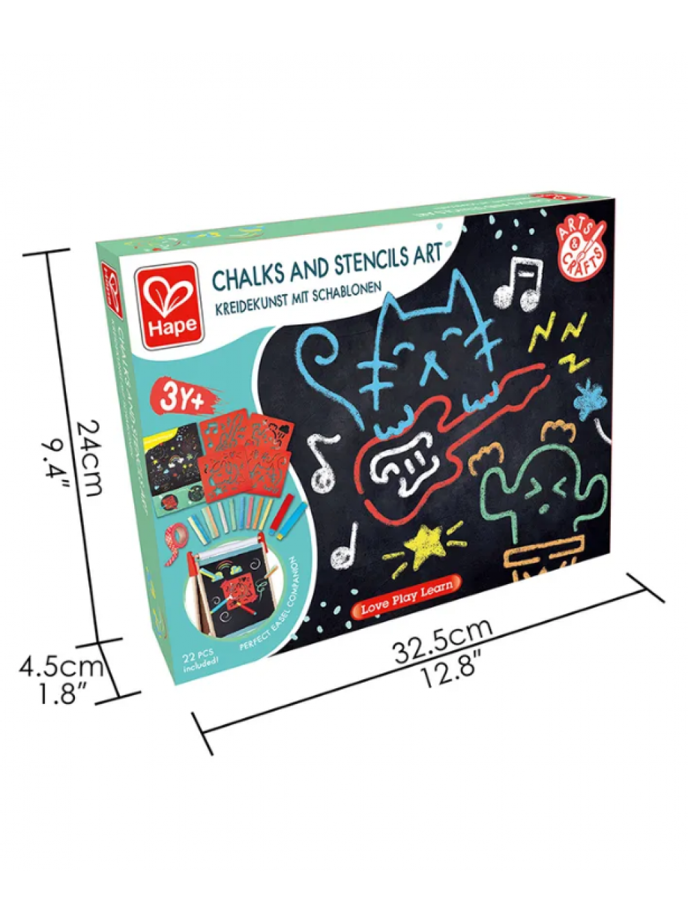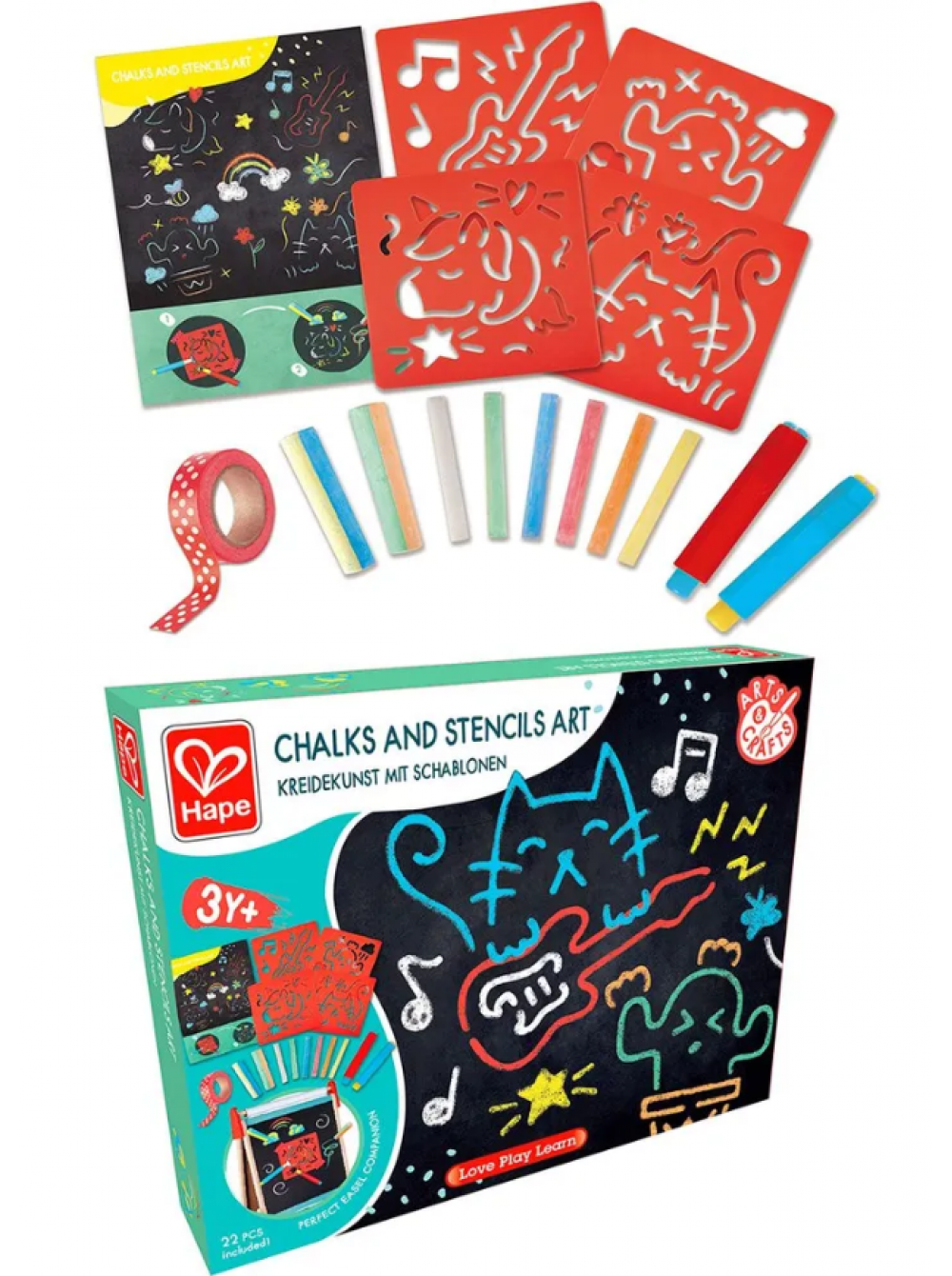 • Набор для рисования мелом и трафаретом идеально подходит для использования на мольбертах Hape!