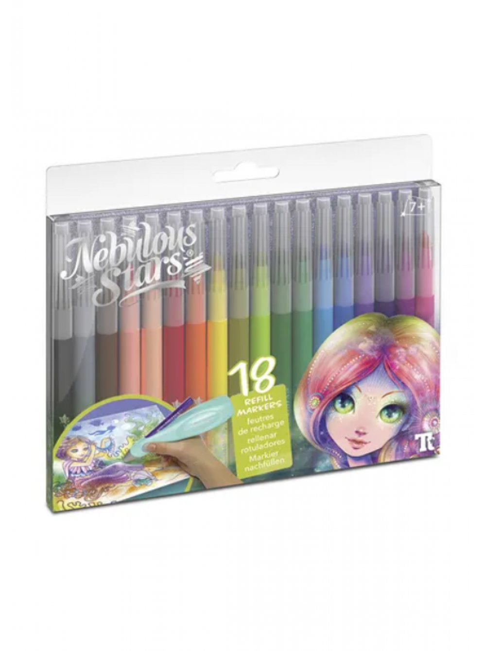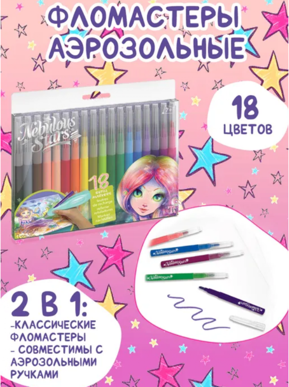 Набор аэрозольных фломастеров для разукрашивания с помощью аэрозольной ручки и без неё. Включает использование фломастеры обычным способом, а также позволяет создавать дополнительный эффект путём распыления краски через специальное устройство. Набор предназначен для детей старше 7 лет.
