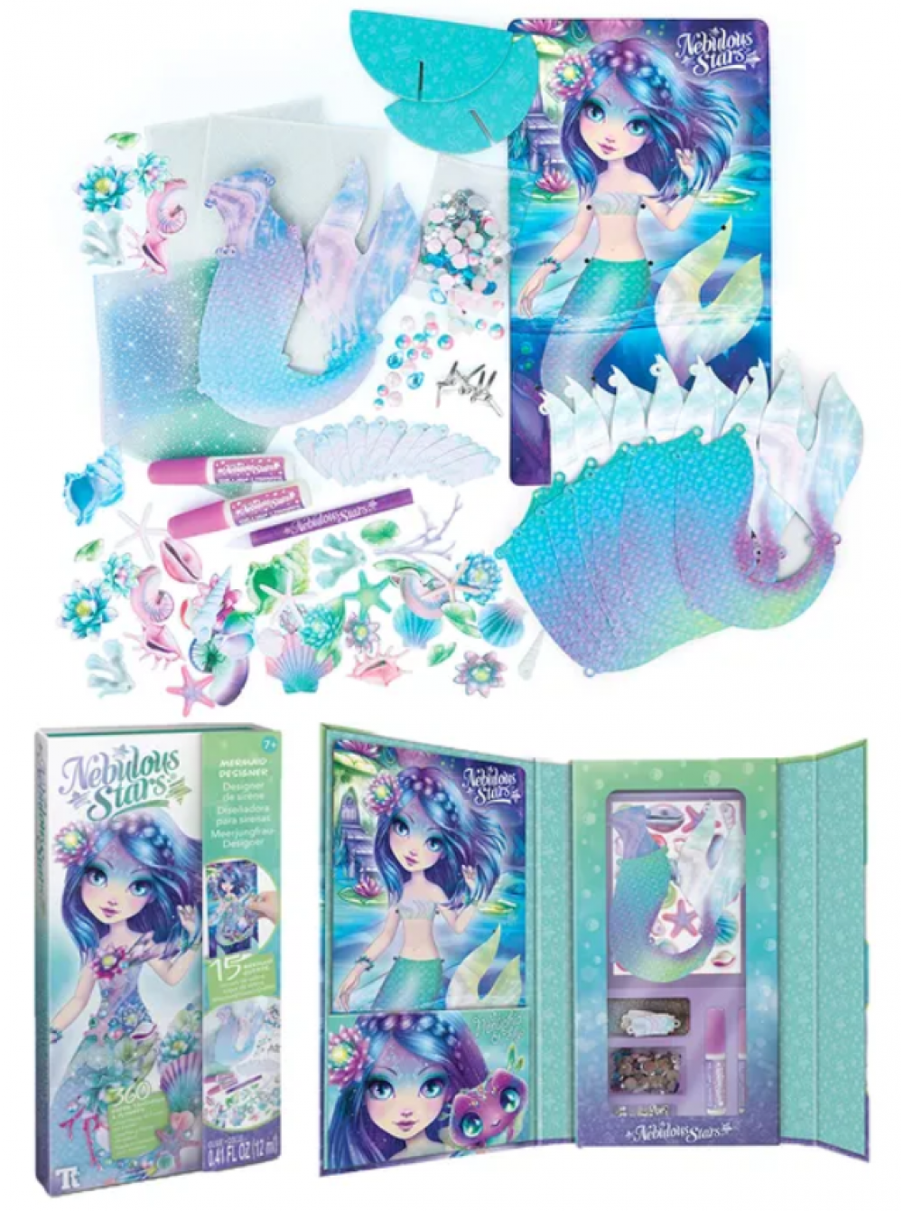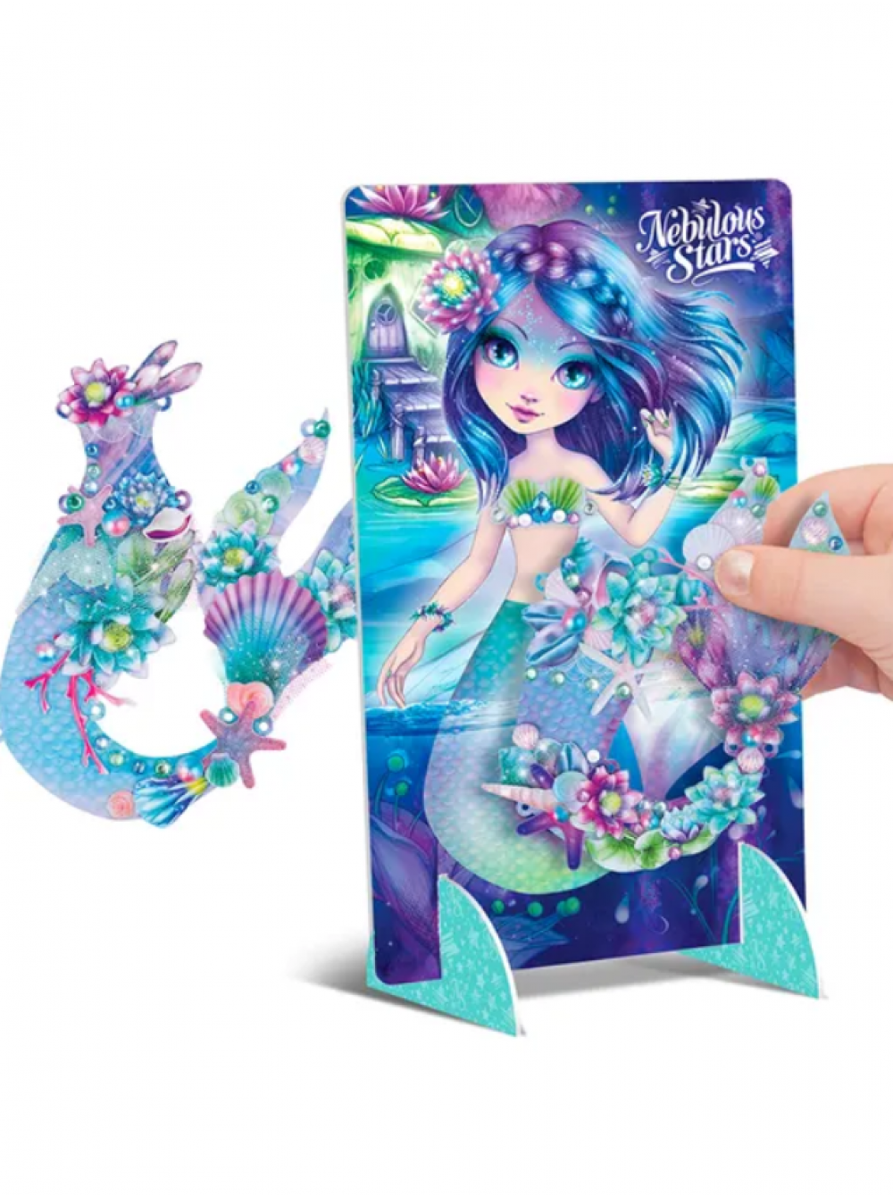 Набор для творчества от звездочки Nenuphia для будущих модельеров и стилистов. Звездочка Nenuphia очень любит плавать как русалка. Ты можешь создать для нее 25 разных русалочьих хвостов, используя заготовки из набора, украсив их бумажными ракушками, цветами, наклейками, блестками и стразами. Ты станешь настоящим дизайнером для своей любимой звездочки!