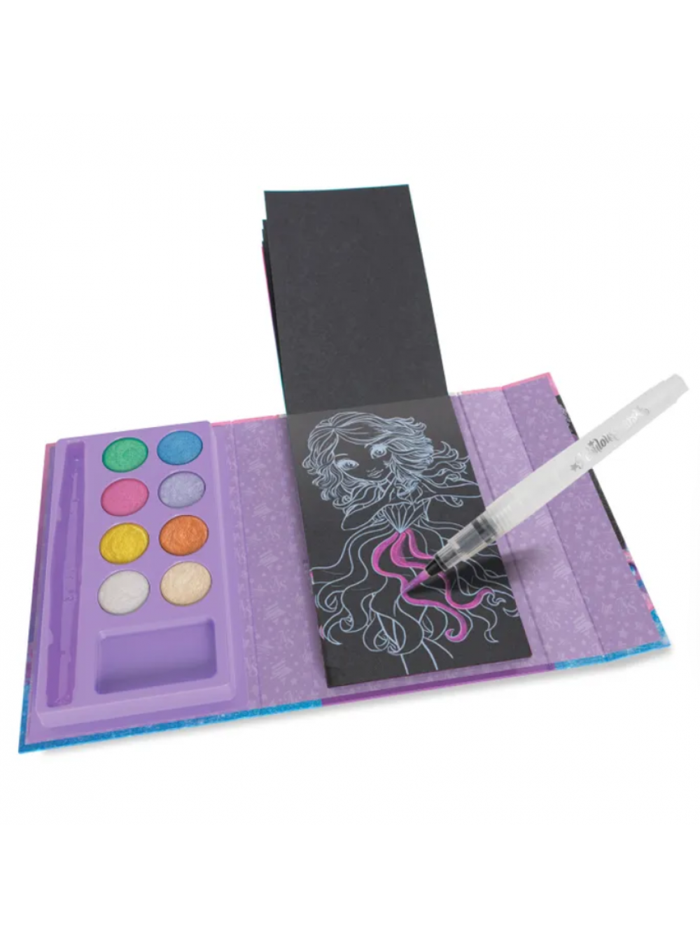 Комплектация: 16 страниц черного цвета с готовыми эскизами, акварельные краски с эффектом металлик (8 цветов), акварельная кисть (многоразовая).