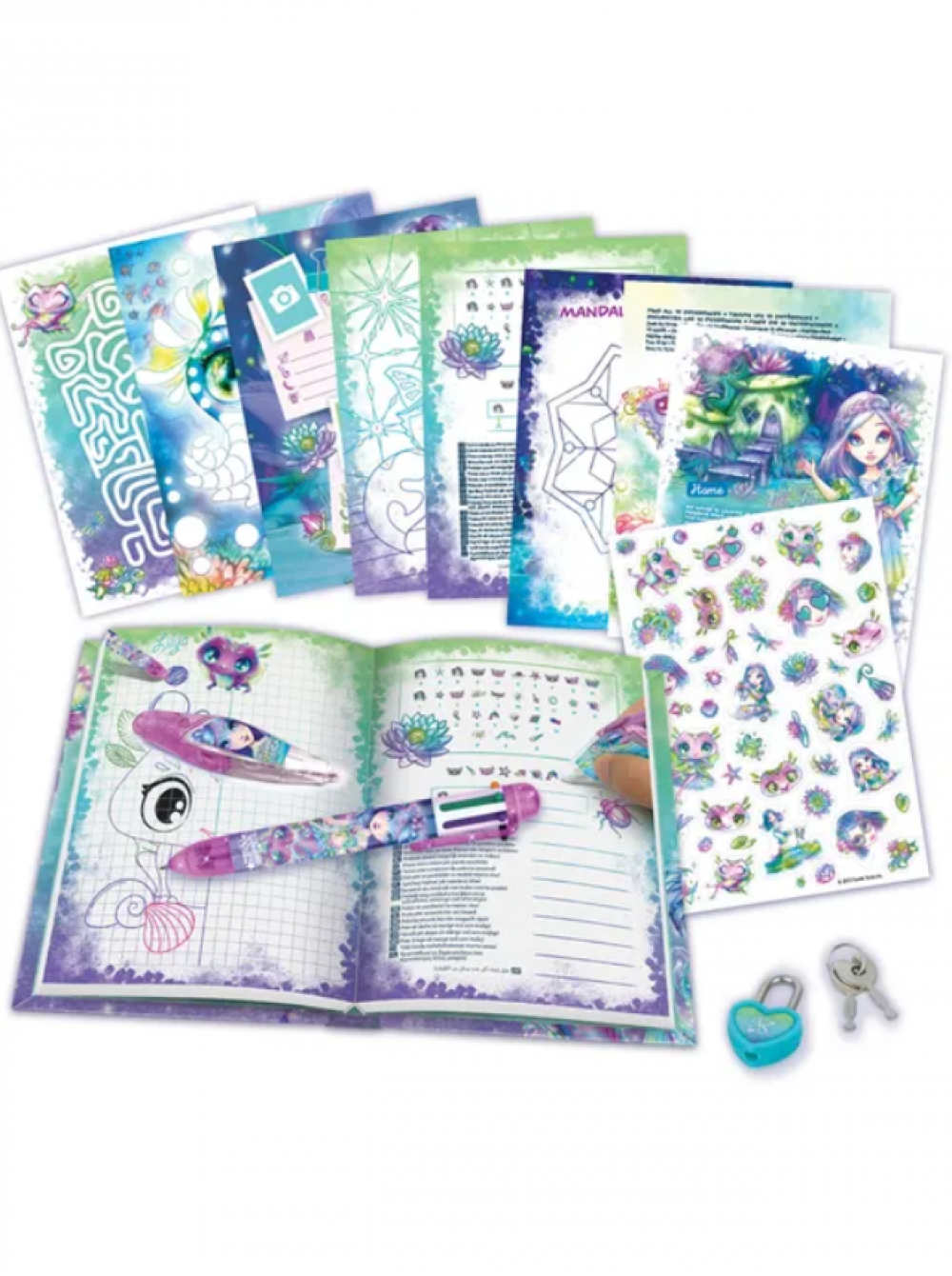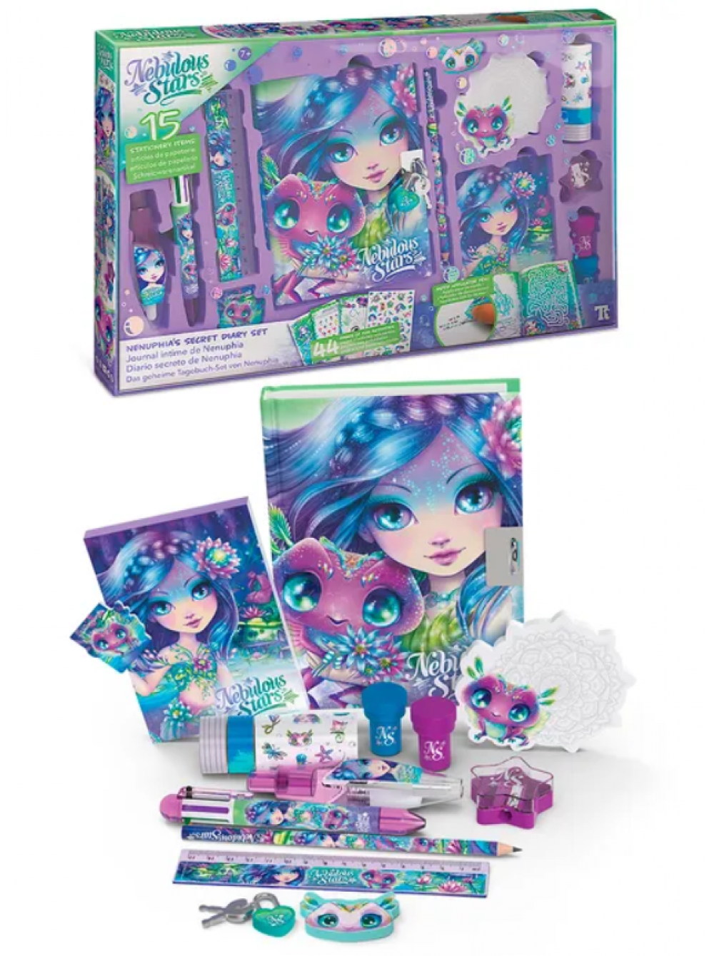 Комплектация: 6-цветная шариковая ручка, ручка-аппликатор с рисунком, блокнот для творчества и раскрашивания, коллекционный ластик, точилка для карандашей, линейка, магнитная закладка, рулон наклеек, карандаш, 2 скрепки для бумаги, 40 стикеров для заметок, 3 рулона клейкой ленты, 2 самоклеящиеся марки; личный дневник (200 стр.) включает: история звёздочки Nenuphia, 44 страницы интересных заданий, страница с наклейками, 150 разлинованных страниц.
