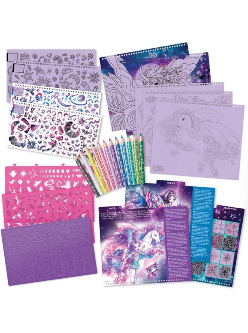 Комплектация: 35 фиолетовых страниц c эскизами, 80 трафаретов, 4 рисунка для втирания, 250 наклеек, 12 цветных карандашей, 12 техник рисования и история единорогов.